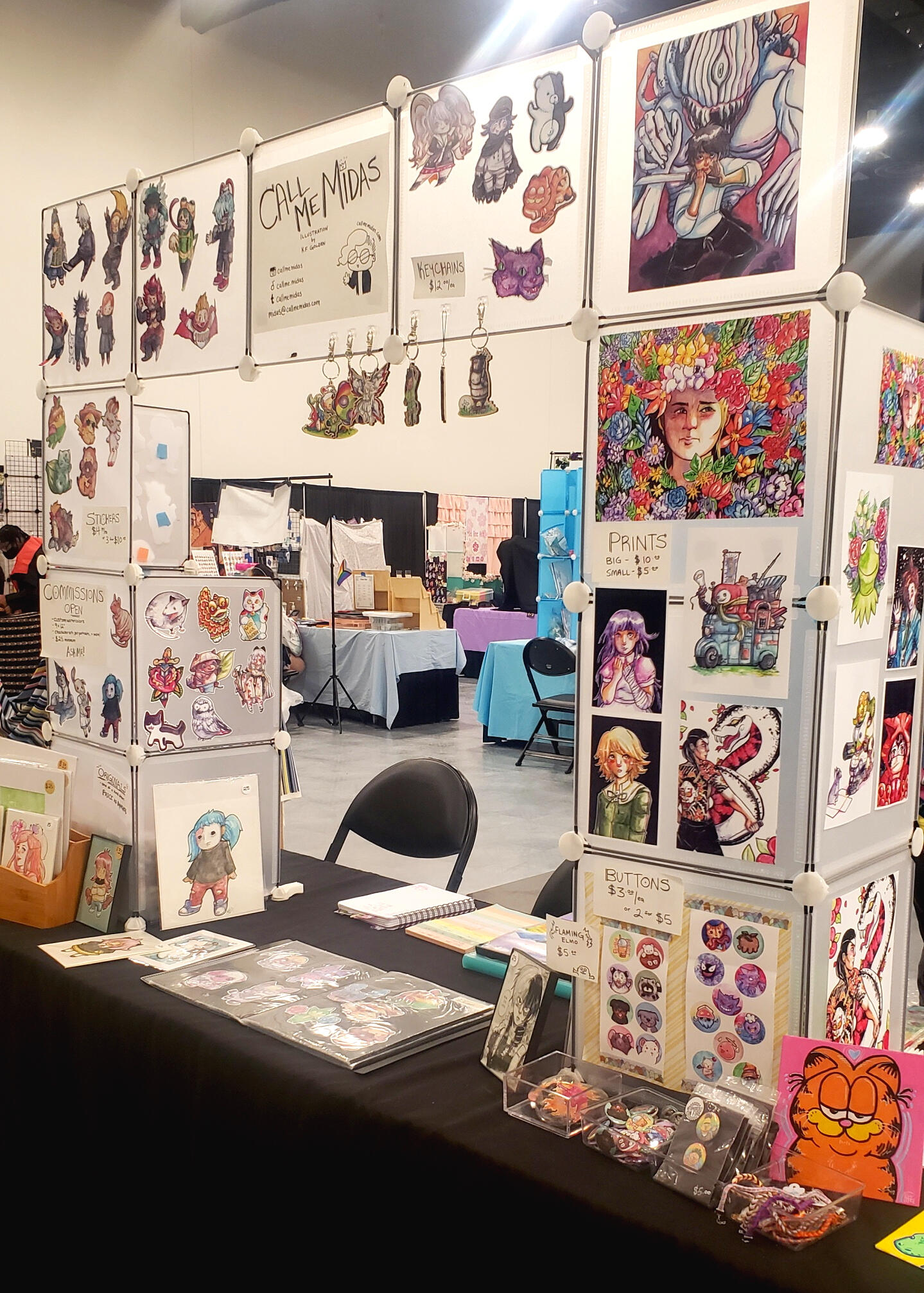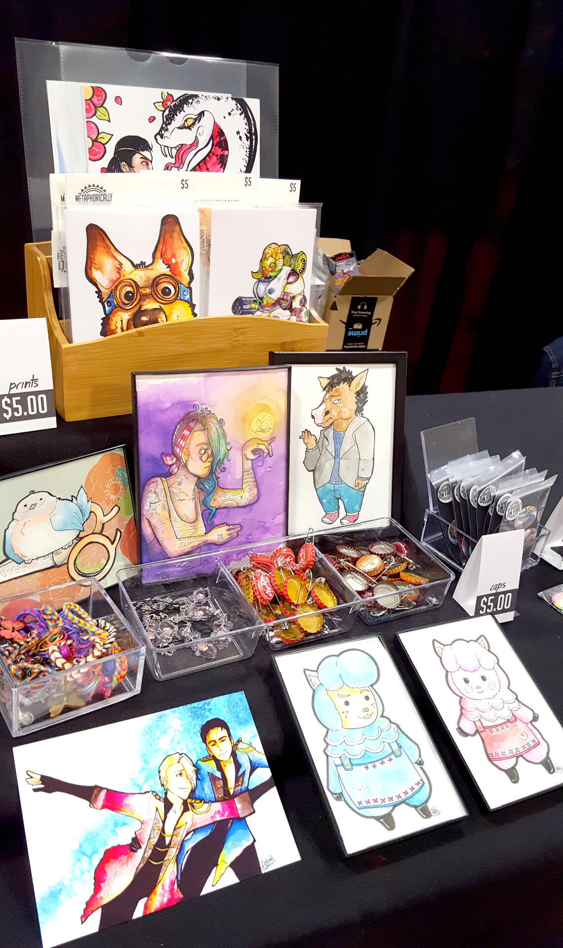 I've been doing artist alleys and guest artist appearances at conventions and expos since 2014, and my work has been featured in gallery shows and pop-up shops across the United States.A lot of my convention work prior to 2021 was done with Alexis Stetson under our combined studio, Metaphorically On Fire.This is not a conclusive list! This is just a selection of the types of events I've been a part of over the years.